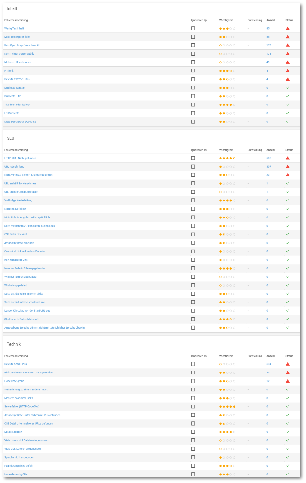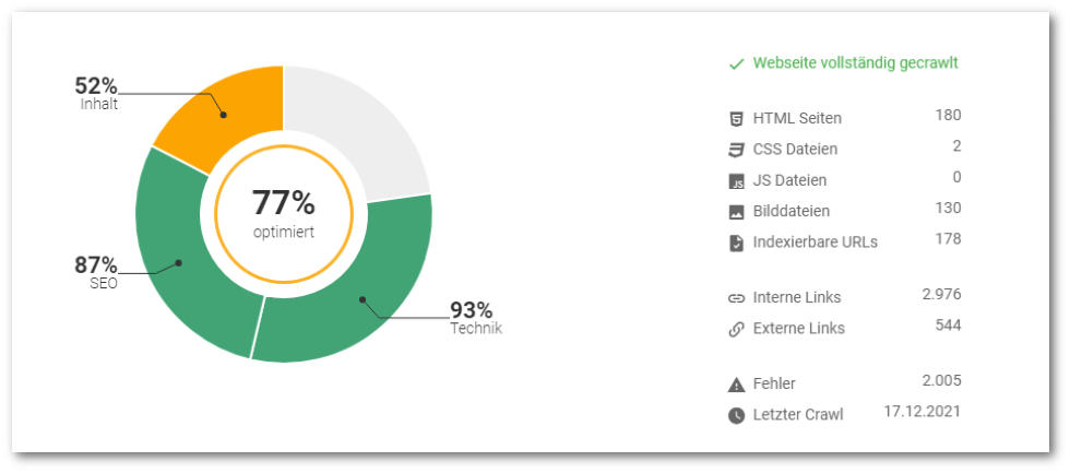 Der Report enthält die Auswertung der wichtigsten Parameter aus den Bereichen Inhalt, Technik und SEO. Dazu gehören beispielsweise doppelt vorhandene Meta-Tags, zu wenig Text, defekte Links, lange Ladezeiten und vieles mehr. Sie sehen sofort, wo Ihre Seite möglicherweise Schwachstellen aufweist und können diese gezielt angehen.