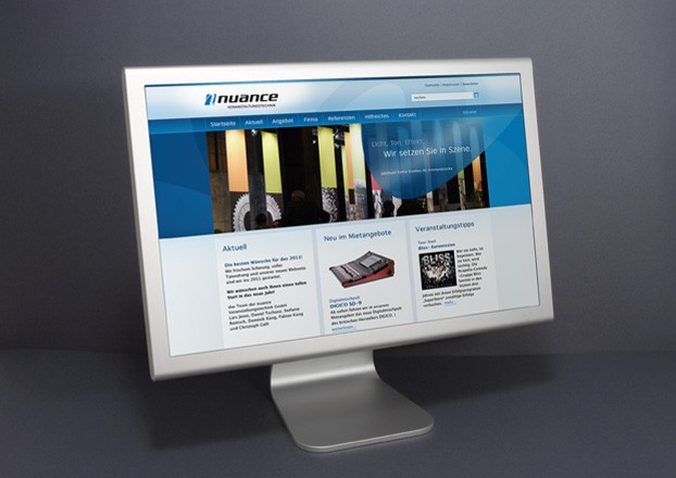 Der Webauftritt der nuance Veranstaltungstechnik GmbH vereint schlichtes, aber ansprechendes Design mit entsprechender Funktionalität. Die Website umfasst einen ausgebauten Mietkatalog mit Online-Bestellmöglichkeit, viele hilfreiche Informationen und Links zur Planung von Anlässen sowie Impressionen und Fakten zu ausgewählten Projekten, welche die nuance GmbH für ihre Kunden verwirklicht hat.