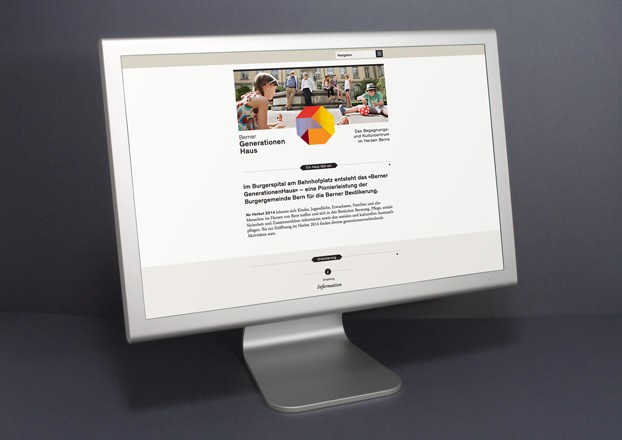 Das «Berner GenerationenHaus» eröffnete 2014 im Burgerspital im Zentrum von Bern als ein schweizweites Pionierprojekt der Burgergemeinde Bern. Die Entwicklung des Erscheinungsbildes fiel in unsere Hand. Ein Oktagon, mit verschieden-farbigen Flächen gefüllt, symbolisiert die Anbieter- und Angebotsvielfalt des Generationenhauses. Gleichsam widerspiegelt es mit seiner Form den Brunnen, seit jeher Treffpunkt des Burgerspitals. In seiner Anwendung bietet es sieben Varianten und wird stets zentral auf das Format platziert. Begleitet wird das Corporate Design vom neu kreierten Label der Burgergemeinde Bern. Eine Broschüre und Einlegekarten mit Infos zu einzelnen Projekten machen den Anfang. Die Microsite zum «Berner GenerationenHaus» wurde zusätzlich als Canvas-App in den Facebookauftritt integriert.