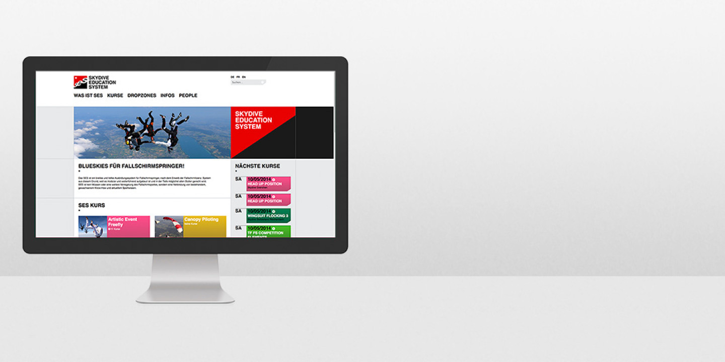 Skydive Education System, abgekürzt SES, ist das schweizerische Ausbildungssystem des Fallschirmsports. Der Kunde wünschte sich einen umfassenden Relaunch der Plattform für das System. Wir gestalteten ein frisches Design und setzten die neue Plattform technisch um. Über 50 Trainerinnen und Trainer schreiben ihre Kurse auf der Website aus und verwalten sowohl ihr eigenes Trainer-Profil, als auch die Anmeldungen ihrer Kursteilnehmenden. 20 Dropzones im Inland und dem benachbarten Ausland sind mit einer Profilseite und ihrem Kursangebot auf der Website präsent.