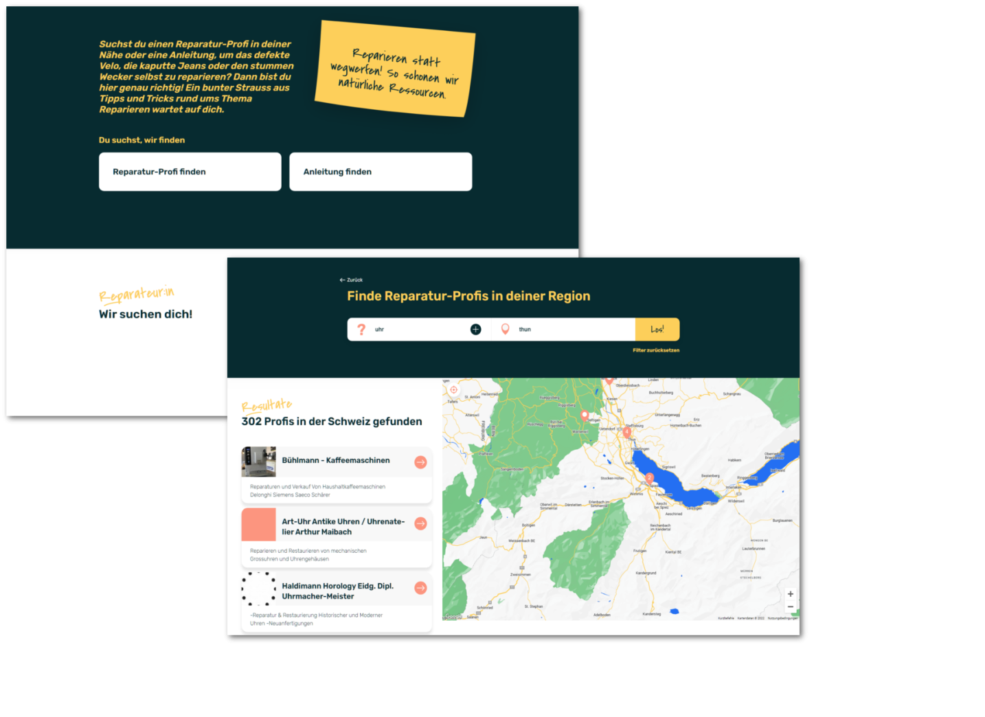 Privatpersonen und Betriebe, die Reparaturen anbieten, können im Login-Bereich einen Account erstellen, ihr Profil selbständig verwalten und mit zusätzlichen Inhalten versehen. Die Profilerstellung ist so programmiert, dass die Ersterfassung von der definierten Stelle freigegeben werden muss. Auf diese Weise lässt sich die Qualität der erfassten Profile mit dem geringstmöglichen Aufwand sicherstellen. Im Backend stehen diverse Funktionen zur Verfügung, um die Daten zu filtern und für die weitere Analyse zu exportieren.