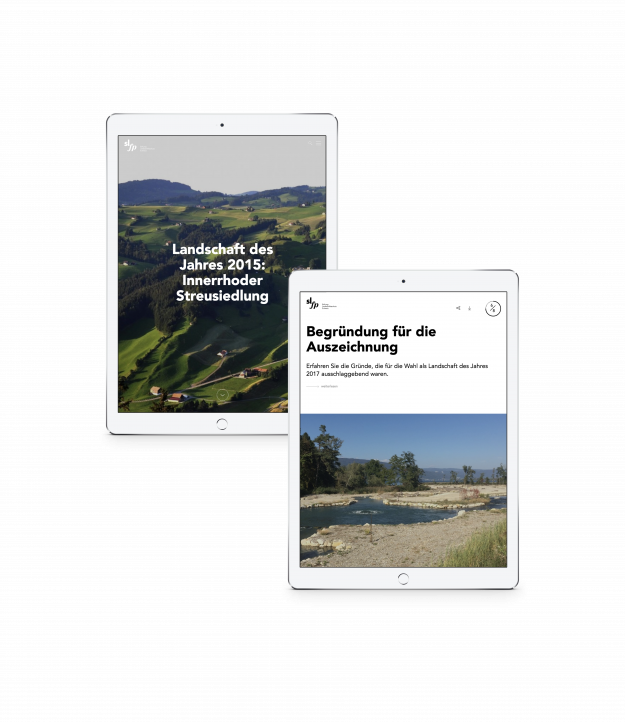 Für die Präsentation der Landschaft des Jahres wünschte die Stiftung ein eigenständiges Layout, dass sich vom Rest der Website absetzt. Hier setzten wir noch stärker auf einen Storytelling-Ansatz. Der Parallax-Scrolling-Effekt sorgt auf den Detailseiten der prämierten Landschaften für eine eindrucksvolle User Experience. Mit jedem Scroll nimmt der User neue Aspekte der Landschaft auf: In grossen Bildern, kurzen Textpassagen, schönen Listen und Videocontent werden die Charakteristika der Landschaften, ihre Geschichten und Menschen für den Lesenden als kleine Geschichte greifbar gemacht. Ein animiertes Seiten-Icon erleichtert die Orientierung.